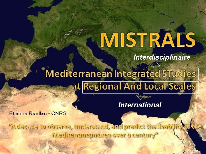 • MISTRALS est un méta-programme international de recherches et d’observations interdisciplinaires et systématiques dédié à la compréhension du fonctionnement environnemental du bassin Méditerranéen sous la pression du changement global pour en prédire l’évolution future. • MISTRALS a pour mission de transformer les objectifs et résultats de recherche en concepts et données accessibles aux décideurs, acteurs territoriaux et gestionnaires, afin d’identifier les besoins et nécessités nationaux et transnationaux et de répondre aux enjeux sociétaux, environnementaux et économiques pour le développement durable des pays et des populations partageant l’aire méditerranéenne. • La vision novatrice de MISTRALS est d’intégrer les analyses scientifiques faites sur le système géophysique constitué par l’aire méditerranéenne avec les besoins sociétaux, dans un souci constant d’optimisation de la communication entre chercheurs d’horizons complémentaires et niveaux de décision. Ainsi, MISTRALS s’articule actuellement autour de 8 programmes thématiques internationaux couvrant :