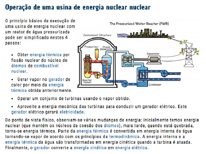 A reação nuclear • Os princípios para o utilização da energia nuclear para produzir eletricidade são os mesmos para a maioria dos tipos de reator. A energia liberada da fissão do combustível é utilizada para produzir vapor. O vapor aciona as turbinas que acionam o gerador que por sua vez gera eletricidade. • O urânio é o combustível básico. São dispostos em tubos para formar barras de combustível. As hastes são dispostas em conjuntos de combustível no núcleo do reator.