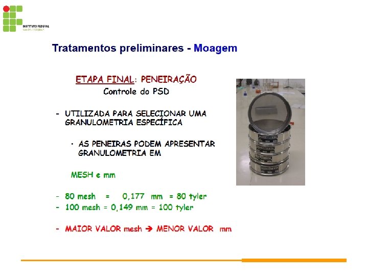 Peneiração Separar mistura de sólidos que possuem tamanhos diferentes. Mesh ou mm Medida granulométrica