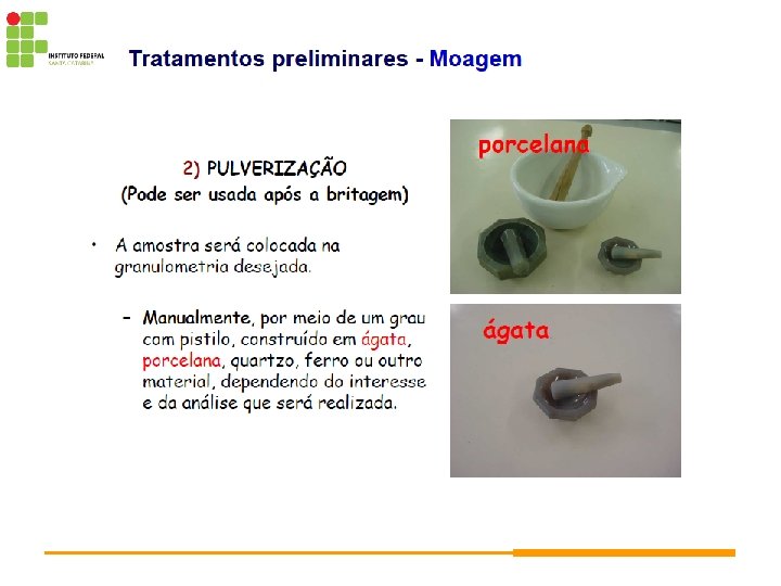 Sólidos: Material homogêneo: analito apresenta-se bem distribuído por toda a amostra. Material heterogêneo: analito apresenta-se não tão bem distribuído por toda a amostra, a amostra apresenta diferença quanto ao tamanho de partículas. Como Proceder a amostragem: Retirar pequenas porções da amostra e triturar em almofariz ou moinho