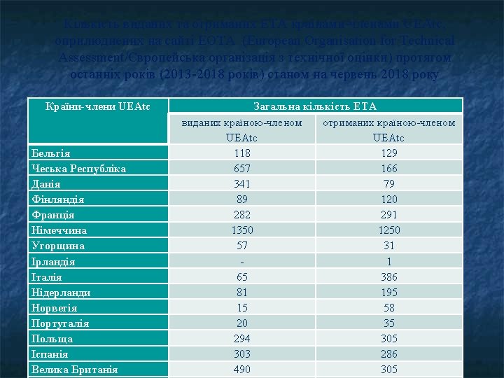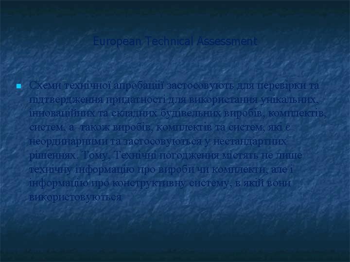 Regulatory documents DBN V. 2. 6 -33: 2018, DSTU B V. 2. 6 -34: 2008, DSTU B V. 2. 6 -35: 2008, DSTU B V. 2. 6 -36: 2008, DSTU B V. 2. 6 -88: 2009 Mandatory requirements for reliability parameters of faсade thermal insulation DBN B. V. 2. 6 -33 Classification of systems : ETICS Suspended faсades Transparent facades DSTU B. V. 2. 634 Procedures of technical assessment and monitoring DSTU B. V. 2. 6 -88 Requirements for ETICS kits and test methods Requirements for suspended façade kits and test methods DSTU B. V. 2. 6 -35 pr DSTU-N B ETAG 004 DSTU B EN 13830 DSTU-N B ETAG 17