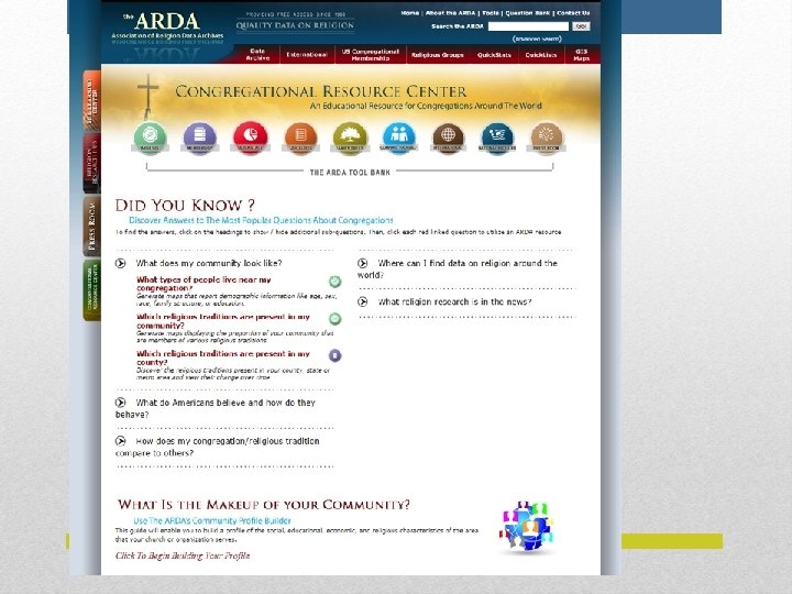 § For next slides… § U. S. Census (or other nation), American Community Survey www. census. gov/acs/www/. § Assoc of Religion Data Archives, www. the. Arda. com/congregations. asp Free Data Online (cont’d)