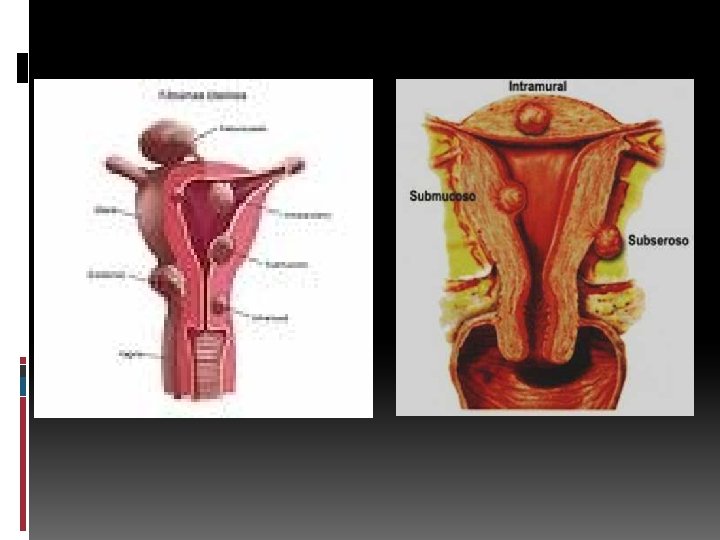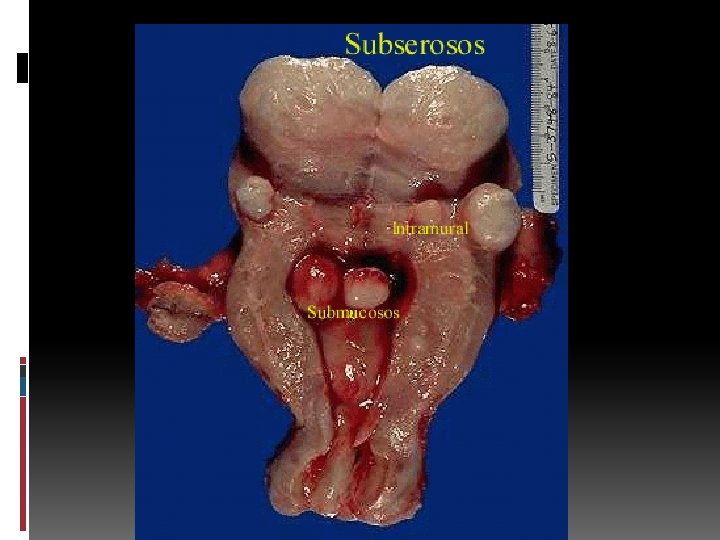 Según su relación con la pared uterina v. Intramurales. v. Subserosos. v. Submucosos. v. Pediculados. v. Satélites.