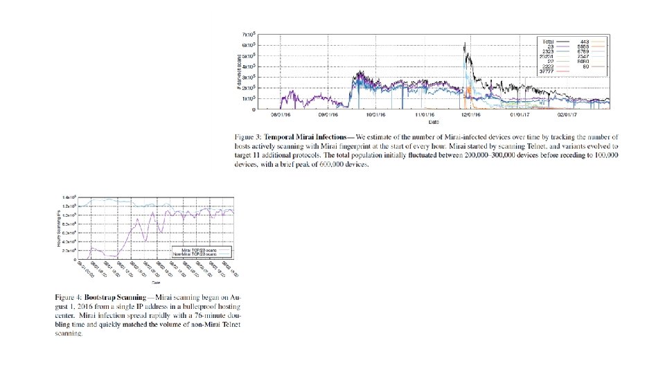 • Bootstrap scan lasted approximately two hours (01: 42– 03: 59 UTC), and about 40 minutes later (04: 37 UTC) the Mirai botnet emerged. Within the first minute, 834 devices began scanning, and 11 K hosts were infected within the first 10 minutes. • Within 20 hours, Mirai infected 64, 500 devices. • Mirai’s initial 75 minute doubling time is outstripped by other worms such as Code Red (37 minute doubling time) and Blaster (9 minute doubling time). • Mirai’s comparatively modest initial growth may be due to the low bandwidth and computational resources of infected devices, a consequence of the low accuracy, brute force login using a small number of credentials, or simply attributable to a bottleneck in loader infrastructure.