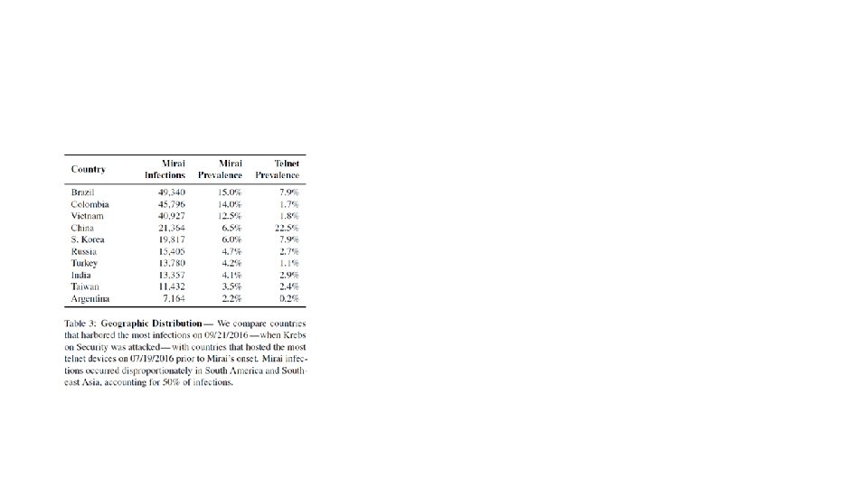 • In September 2016, a spree of massive distributed denial of service (DDo. S) attacks temporarily crippled Krebs on Security, OVH, and Dyn. • attack on Krebs exceeded 600 Gbps in volume > 105 compromised devices • Success factors: • efficient spreading based on Internet wide scanning, • rampant use of insecure default passwords in Io. T products, and • keeping the botnet’s behavior simple would allow it to infect many heterogeneous devices • the botnet infected nearly 65, 000 Io. T devices in its first 20 hours before reaching a steady state population of 200, 000– 300, 000 infections • These bots fell into a narrow band of geographic regions and autonomous systems, with Brazil, Columbia, and Vietnam disproportionately accounting for 41. 5% of infections.