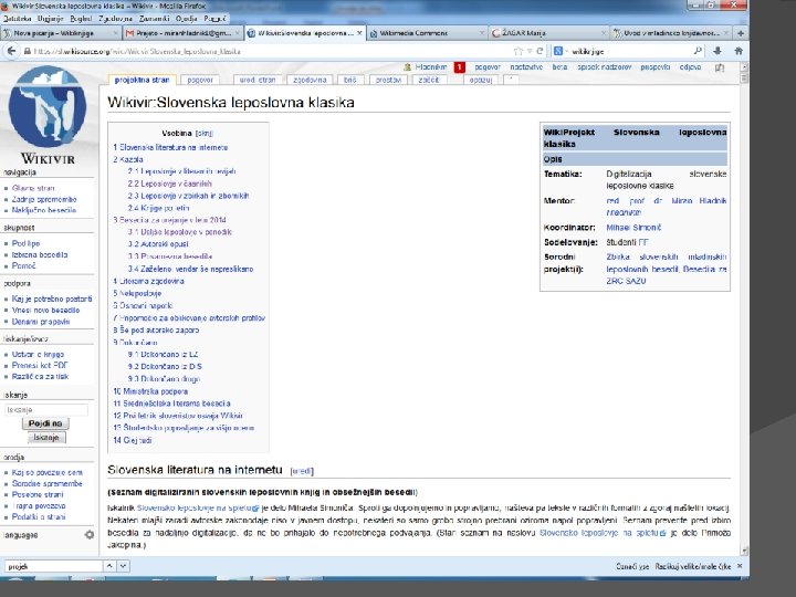 Študentski projekti na Wikiviru � Slovenska leposlovna klasika 2007� prirastek 4 mio besed/leto � podpora Ministrstva za kulturo � vir: d. Lib, Internet Archive � cilj: vpis v podatkovno zbirko Slovensko leposlovje na spletu