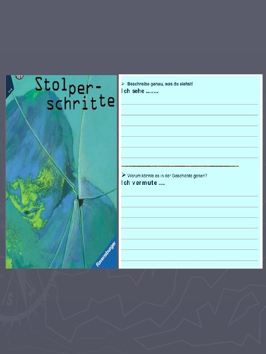 Alternativen zum Einstieg Vor der Lektüre Ausfüllen des „Bücherbaums“ zur Bewusstwerdung persönlicher Leseerfahrungen ► ► Doppelkreis zu Lesegewohnheiten Lehrervortrag S. 7, 3. Abschn. , 2. Zeile > schriftliches oder mündliches Antizipieren der Handlung ► ► Cluster zum Titel „Stolperschritte“ Themenbilder (Behinderung, Einsamkeit, Egoismus, Sprachlosigkeit, Wut, Verzweiflung, Tod, Hoffnung, Kraft, Einfühlsamkeit, Anteilnahme, Erwachsenwerden u. a. ) ► Stumme Schreibgespräche zu Personen ► Nach der Lektüre ► Doppelkreis zu Leseerfahrungen