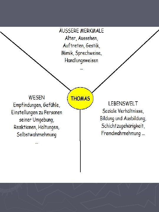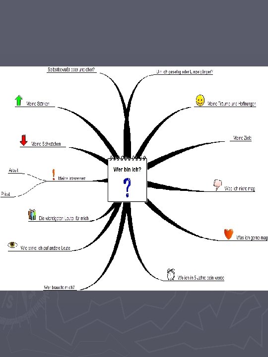 VISUELLE GESTALTUNGEN (Ästhetische Gestaltung, Grafiken, Schaubilder etc. ) ► Cluster und Mindmaps zu Personen und Motiven entwickeln ► Gedanken, Wünsche, Hoffnungen, Ängste der handelnden Personen mit Bildern und Symbolen darstellen (vgl. AB) Gemütszustände mit Farben ausdrücken (Aggression, Unsicherheit, Melancholie, Trauer, aber auch Zufriedenheit, etc. ) und mit entsprechenden Zitaten ergänzen ► ► Lesezeichen gestalten mit Zitaten Stationen der Entwicklung von Thomas graphisch darstellen („Fieberkurve“) und mit entsprechenden Zitaten kenntlich machen(„Stationen einer Entwicklung“ oder „Stationen des Erwachsenwerdens“) ► § Die Ambivalenz in der Beziehung von Thomas zu seiner Mutter visualisieren ► Die Beziehungen der Personen untereinander zu Beginn und am Ende der Handlung auf einem Poster visualisieren ► ► Arbeit mit dem Wertequadrat Ein Deckblatt zur Unterrichtseinheit entwerfen