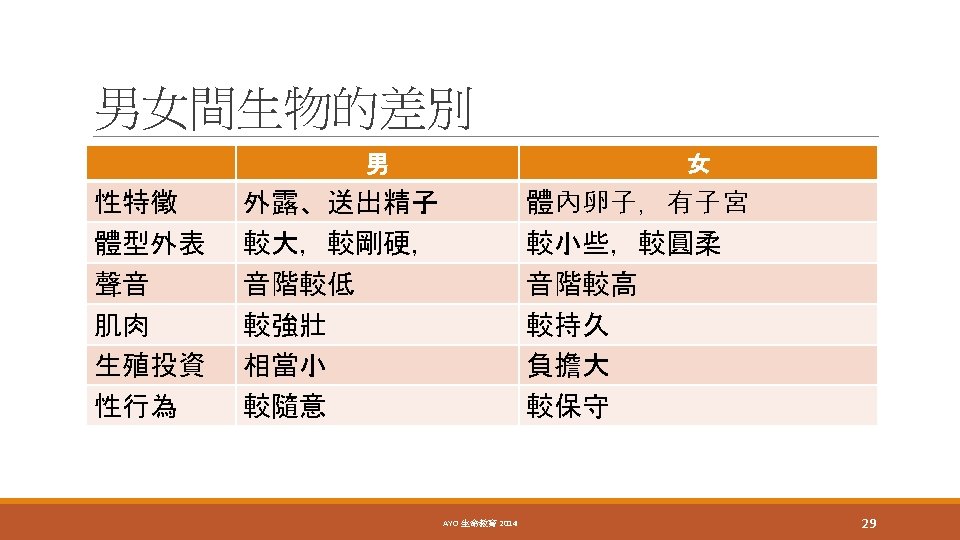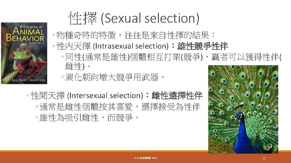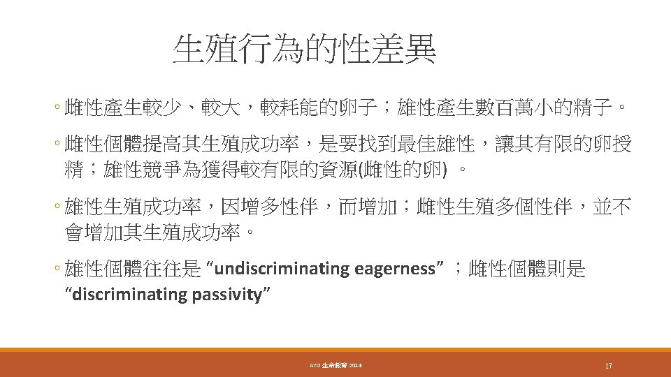 Bateman’s principle Work on fruit flies Females should be the choosier sex because eggs are expensive and because a female’s reproductive success is limited compared with that of a male, and this should translate into greater variance in the reproductive success of males. AYO 生命教育 18 2014
