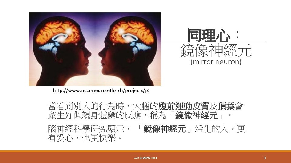 鏡像神經元 (mirror neuron) http: //en. wikipedia. org/wiki/File: Makak_neonatal_imitation. png AYO 生命教育 2014 4