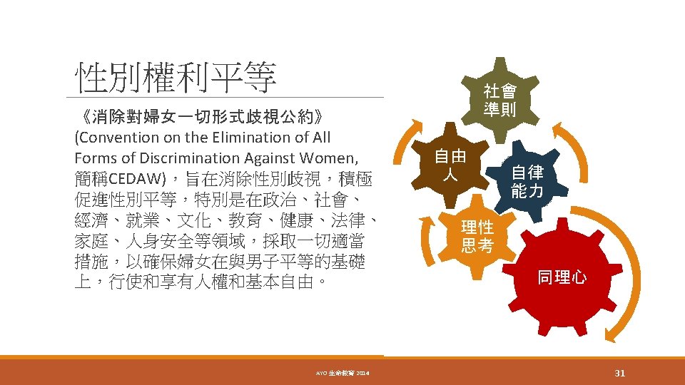 Kantian ethics (康德倫理學) Maximized (最大化) Love (愛) Freedom + Justice + Equality 自由 + 正義 + 公平 AYO 生命教育 2014 12