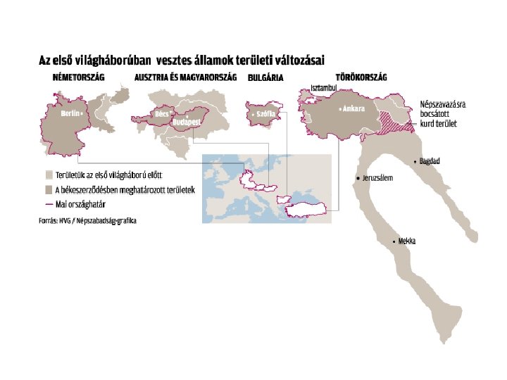 Németország, Ausztria, Bulgária és Törökország lakóinak többsége ma már alig gyászolja az 1919 -20 -ban elcsatolt területeket Leginkább azért, mert nincsenek a Kemal Atatürk vezetésével az határaikon túl sok százezres 1920 -as években a törökök tömegeik. visszahódították a Kaukázussal szomszédos A másik ok, hogy a vesztesek közül területeket, égei-tengeri többen átéltek már a megelőző évtizedekben hasonló kataklizmát. partvidékét, Kelet-Trákiát. Bulgária visszakapta 1940 -ben (Bulgária 1913 -ban Macedoniát, Dél-Dobrudzsát, és Sztálin az osztrákok 1866 -ban a akaratából meg is tarthatta. königgratzi csatát, a törökök Ausztria és Törökország 1878/79 -ben a Balkánt és lemondott a dicső múlt majdnem a saját fővárosukat felemlegetéséről. vesztették el. ) Ausztria és Törökország Németországot 1945 után még lemondott az etnikai elv szerint hozzájuk nem tartozó nagyobb területi vesztesség érte területekről.