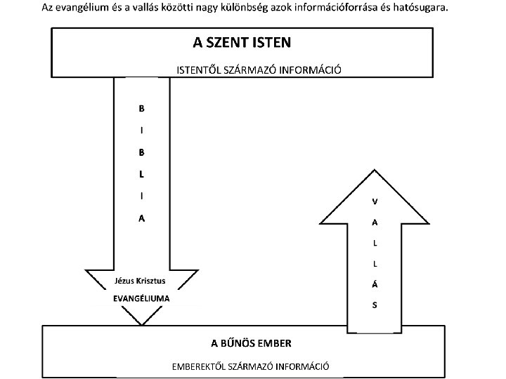 Az emberek vallásai és az evangélium közti különbség a Biblia nézőpontjából (5) • Az ábra mutatja, hogyan hidalta át Isten azt a nagy szakadékot, amely közte és a bűnös ember között van. Az isteni információ a Jézus Krisztusról szóló evangéliumban éri el csúcspontját. • Ezzel szemben állnak az emberi információk, a vallások formájában.