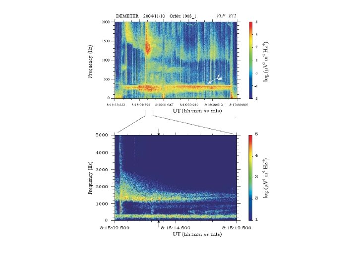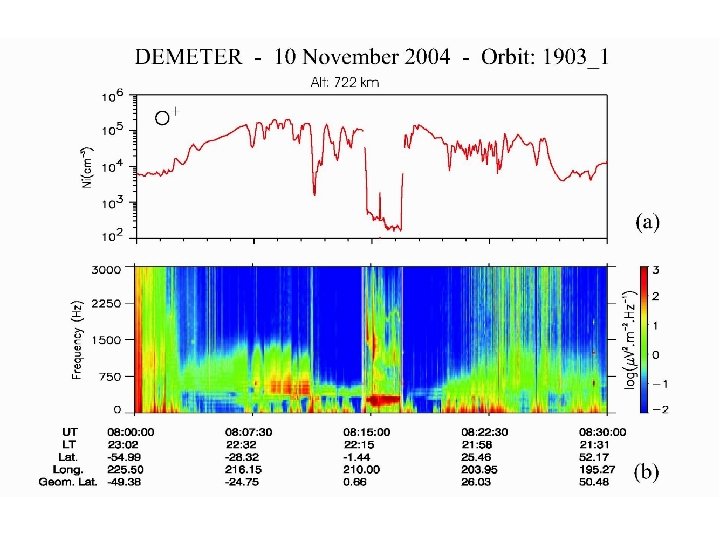 Lower Hybrid Emissions 1 - Bursts of electrostatic LH turbulence triggered by strong whistlers, High intensity, 104 µV 2/m 2. Hz at ωLH Relaxation time ~ 10 s 2 - Evolve as solitary, monochromatic LH structures Large amplitude (~10 m. V/m) wave packets, duration ~ 20 ms, Most often detected in localized density holes (ΔNi/Ni ~ -10% to -15%) Interpretation LH turbulence: scattering of whistler waves by pre-existing irregularities (e. g. Bell and Ngo, 1990) LHSS as eigenmodes of cylindrical magnetic field aligned depletions (e. g. Schuck et al. , 1998)