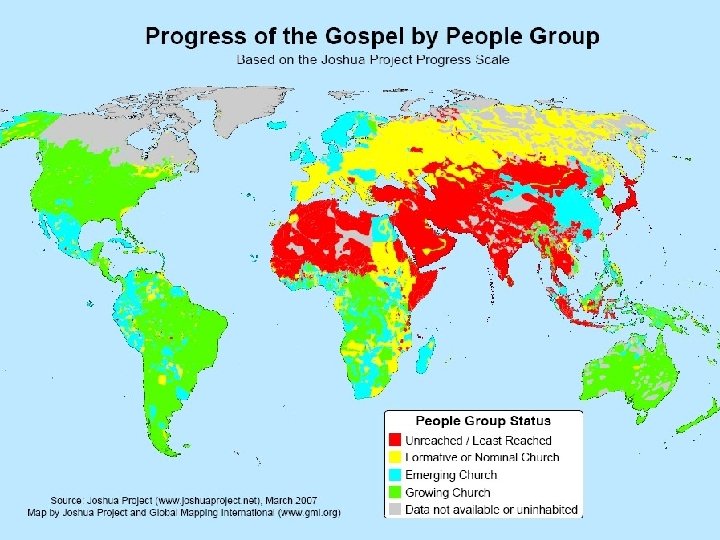 The Unfinished Task • 28% are without access to gospel • 39. 5% of the world’s individuals are members of ethne with no viable church • While 72% of the world is adequately evangelized, 1, 800, 228, 000 are left. * *David Barrett, Todd Johnson and Peter F. Crossing, “Status of Global Mission, 2005, in Context of 20 th and 21 st Centuries, ” International Bulletin of Missionary Research, Jan. 2005, p. 29. Source: Stan Park, Ethne ’ 06