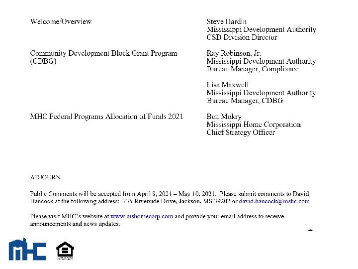 PUBLIC COMMENTS Draft Plan Availability • April 8, 2021 • www. mshomecorp. com Public Comment Period • April 8, 2021 -May 10, 2021 Public Comments should be submitted to: • Mississippi Home Corporation • Attn: David Hancock • 735 Riverside Drive • Jackson, MS 39202 • david. hancock@mshc. com