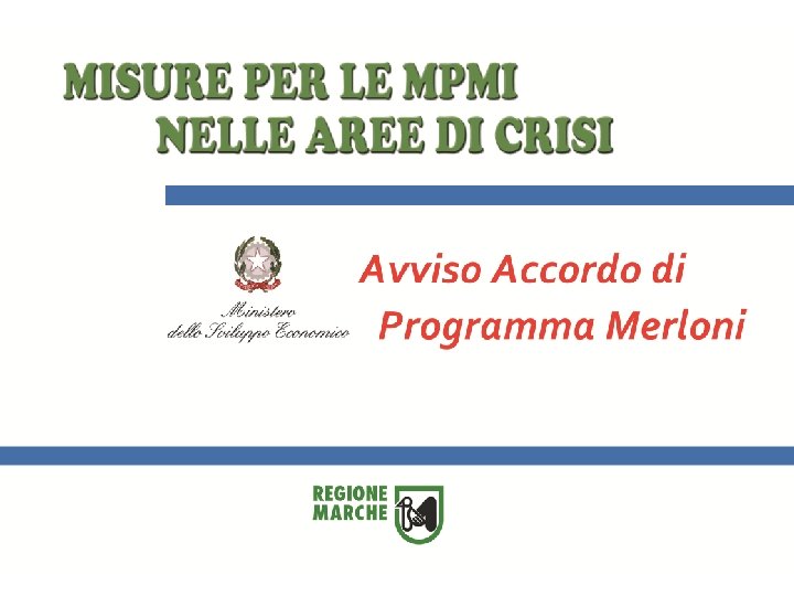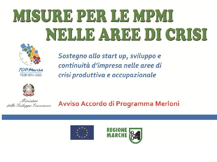 MISURA PER LE MPMI NELLE AREE DI CRISI AVVISO ACCORDO DI PROGRAMMA ANTONIO MERLONI EX LEGGE 181/89 Normativa di riferimento ü Accordo di programma siglato nel marzo 2010 ü Primo atto integrativo sottoscritto nell’ottobre 2012 ü Secondo Atto integrativo Accordo di programma A. Merloni, sottoscritto il 18 marzo 2015 ü Decreto Mise del 9 giugno 2015 ü Circolare Mise del 9 agosto 2015 ü Avviso di imminente pubblicazione ü Reg. (UE) 651/2014 o Regolamento GBER