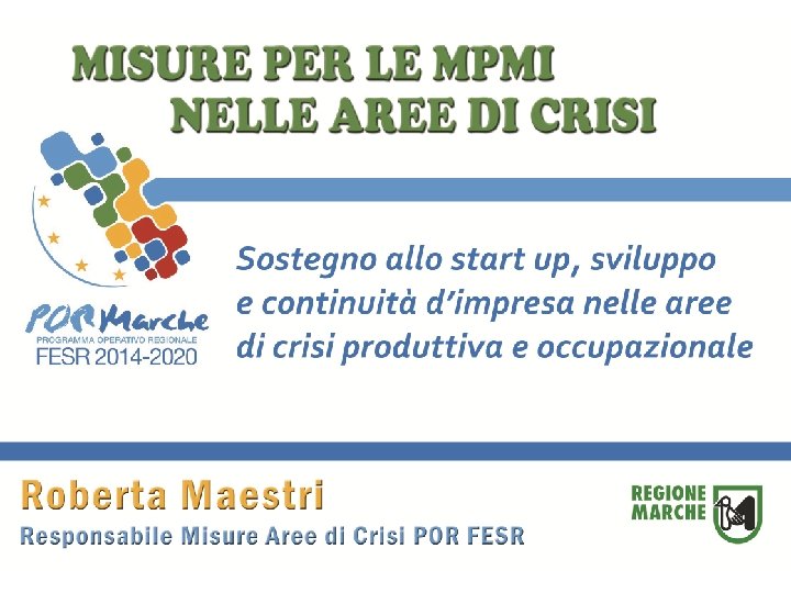 MISURA PER LE MPMI NELLE AREE DI CRISI Aree di crisi produttiva: Territori interessati ü Area dell’Accordo di programma Merloni: 56 comuni distribuiti nelle province di Ancona, Macerata e Pesaro Urbino (Acquacanina, Arcevia, Barchi, Belforte del Chienti, Belvedere Ostrense, Bolognola, Caldarola, Camerino, Camporotondo di Fiastrone, Castelbellino, Castelleone di Suasa, Castelplanio, Castelraimondo, Castelsantangelo sul Nera, Cerreto d'Esi, Cessapalombo, Cupramontana, Esanatoglia, Fabriano, Fiastra, Fiordimonte, Fiuminata, Fratte Rosa, Frontone, Gagliole, Genga, Jesi, Maiolati Spontini, Matelica, Mergo, Mondavio, Monsano, Monte Cavallo, Monte Roberto, Morro d'Alba, Muccia, Orciano di Pesaro, Pergola, Pieve Torina, Pievebovigliana, Pioraco, Poggio San Marcello, Poggio San Vicino, Rosora, San Costanzo, San Lorenzo in Campo, San Marcello, San Paolo di Jesi, Sassoferrato, Sefro, Serra San Quirico, Serra Sant'Abbondio, Serrapetrona, Serravalle di Chienti, Ussita, Visso); ü Area in crisi della provincia di Pesaro Urbino (n. 30 comuni individuati con DGR 1166/2015 ü Area del Piceno