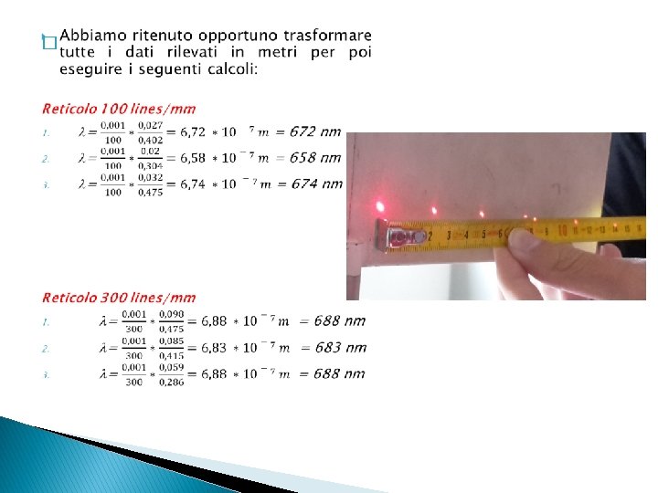 Reticolo 300 lines/mm D (cm) y (cm) Prima misurazione 47, 5 9, 8 Seconda misurazione 41, 5 8, 5 Terza misurazione 28, 6 5, 9 Reticolo 600 lines/mm D (cm) y (cm) Prima misurazione 28, 6 12, 7 Seconda misurazione 24, 5 10, 8 Terza misurazione 20, 4 9, 1