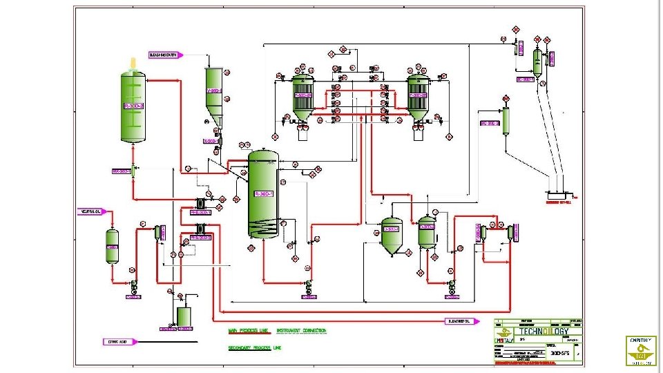 DRY DEGUMMING AND BLEACHING The oil to be bleached coming from other plants or from storage is filtered in order to remove any entrained solid particles contained in it. The filtered oil is then heated up to operating temperature by a plate heat exchanger. Afterward, an oil-citric acid mixture passes into reaction vessel where it remains for the time necessary to the completion of the degumming reaction. Degummed oil is sucked into the upper part of the bleacher. The bleacher is divided in two parts: the upper one has a coil fed with steam under temperature control, which heats the slurry at the required temperature. Being the bleacher under vacuum, any trace of moisture left in the oil is removed. The heated slurry flows continuously into the lower part of the bleacher where a mixing with steam provides for an intimate contact between the oil and the bleaching earths. The slurry coming out of the bleacher is transferred to one of the two NIAGARA type filters and then sent to storage.