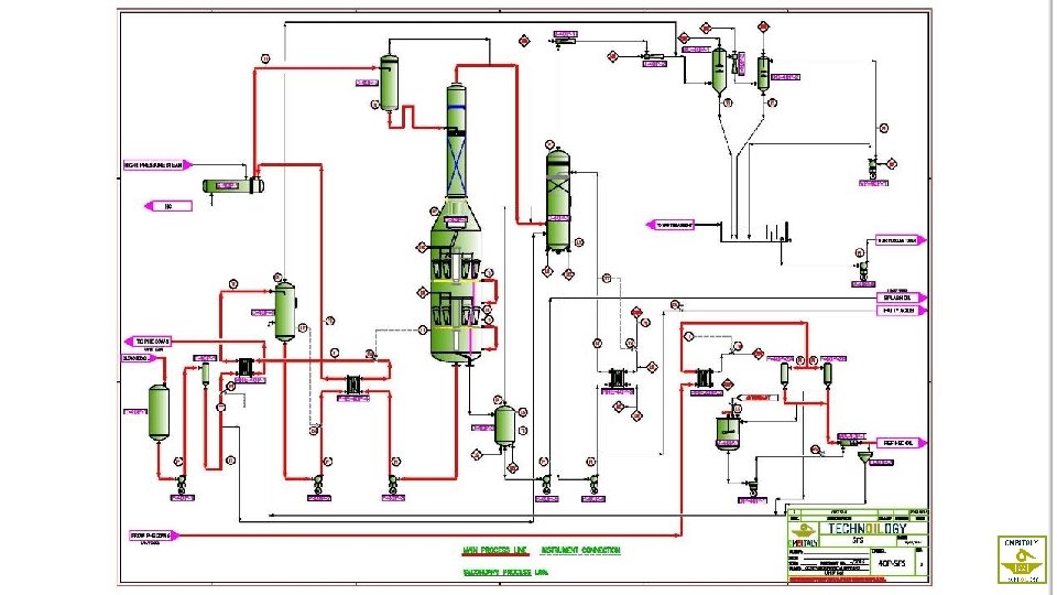 PHYSICAL REFINING AND DEODORIZING During this step, the bleached oil is heated up to the temperature of operation of dehydrator by a heat transfer from the hot deodorised oil. From the dehydrator, the oil is transferred to heat exchangers, to the flash drum - where part of the fatty acids evaporates - and then to the pack column. This system of exchangers allows a good heat recovery. The oil is retained for a pre-set time in the physical refining column which comprises of: Ø an upper part, with a special packing to facilitate an intimate contact between the incoming oil and the steam, where the deodorising/physical refining begins Ø a lower part, where the oil is subjected to a violent live steam injection blown in by mammoth pumps, where deodorising is completed.
