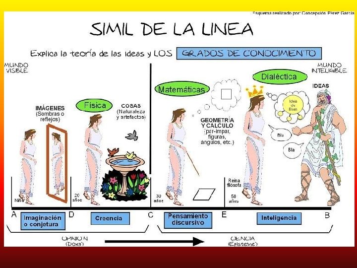 “Bastará, pues con llamar a la primera parte, conocimiento; a la segunda, pensamiento; a la tercera, creencia; e imaginación a la cuarta. Y a estas dos últimas juntas, inteligencia. La opinión se refiere a la generación, y la inteligencia a la esencia; y lo que es la esencia con relación a la generación; lo es la inteligencia con relación a la opinión, lo es el conocimiento con respecto a la creencia y el pensamiento con respecto a la imaginación” (Platón; “La República”