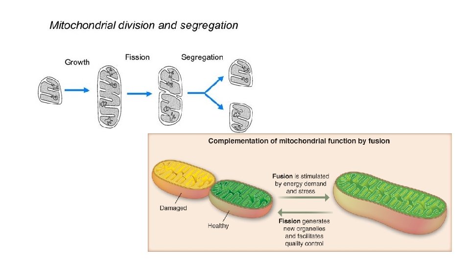 DNA of mitochondria • Mitochondria contain deoxyribonucleic acid (DNA) and ribosomes, protein-producing organelles in the cytoplasm. • Within the mitochondria, the DNA directs the ribosomes to produce proteins as enzymes, or biological catalysts, in ATP production. • This DNA is small and circular. It has only 16, 500 or so base pairs in it. And it encodes different proteins that are specific for the mitochondrial. • Mitochondrial DNA, unlike nuclear DNA, is inherited from the mother, while nuclear DNA is inherited from both parents. • Mitochondrial division is important for the remodeling and rearrangement of mitochondrial networks, as well as for enabling mitochondrial segregation during cell division. • By enabling genetic complementation, fusion of the mitochondria allows for two mitochondrial genomes with different defects within the same organelle to individually encode what the other lacks. In doing so, these mitochondrial genomes generate all of the necessary components for a functional mitochondrion. • https: //www. youtube. com/watch? v=HIR 2 we. Kk 3 gg