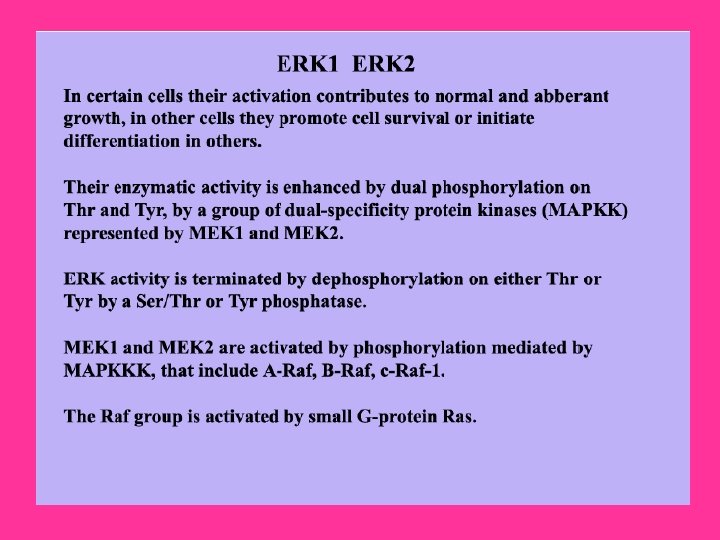 ERK, the most widely studied MAPK cascade, have been established as a major participant in the regulation of cell growth and differentiation, but when improperly activated contribute to malignant transformation. ERK 1 and ERK 2 form the central component in the ERK cascade. The ERK signaling cascade is activated by a wide variety of receptors involved in growth and differentiation including GPCRs (G-Protein Coupled Receptors), RTKs (Receptor Tyrosine Kinases), Integrins, and Ion Channels. A general activation scheme involves the activation of RTKs by Growth Factors, such as EGF (Epidermal Growth Factor). The subsequent auto-phosphorylation of the cytoplasmic tails of the receptor on tyrosine leads to the tyrosine phosphorylation of the adapter protein SHC can then recruit the GRB 2 (Growth Factor Receptor Bound Protein-2)-SOS (Son of Sevenless protein) complex to the membrane via the SH 2 domain of GRB 2 binding to the phosphotyrosine on SHC. SOS, a GEF for Ras, can then exchange the GDP bound to Ras to GTP. Once Ras binds GTP, it can then recruit the Serine/threonine kinase Raf to the membrane. When Raf translocate to the membrane, it becomes activated and then phosphorylates the dual specificity kinases MKK 1 and MKK 2. The activated MKKs phosphorylate ERK 1/ERK 2 on Threonine 183 and Tyrosine 185 (at the TEY motif) (Ref. 3). GPCR also play an important role in activation of ERKs. When the GPCR becomes activated by Ligands such as Neurotransmitters, Cytokines etc. , it leads to the exchange of GDP for GTP on the GN-Alpha (Guanine Nucleotide -Binding Protein-Alpha) subunit. Upon activation, GN-Alpha. I (Guanine Nucleotide-Binding Protein-Alpha-I) or GN-Alpha. Q (Guanine Nucleotide. Binding Protein-Alpha-Q) subunits are separated from GN-Beta (Guanine Nucleotide-Binding Protein-Beta) and GN-Gamma (Guanine Nucleotide. Binding Protein-Gamma) subunits and are converted to their GTP bound states that exhibit distinctive regulatory features on the nine tm. ACs (Transmembrane Adenylate Cyclases) in order to regulate intracellular c. AMP (Cyclic Adenosine 3', 5'-monophosphate) levels.