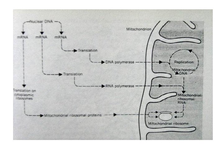 Hubungan DNA inti dengan DNA mitokondria DNA inti membentuk 3 m. RNA untuk sintesis: 1. DNA polimerase yg dikirim ke mitokondria replikasi DNA mitokondria. 2. RNA polimerase yg dikirim ke mitokondria sintesis RNA ribosom mitokondria (r. RNA). 3. Protein ribosom mitokondria yg ditranslasi di sitoplasma dikirim ke mitokondria bersama dng r. RNA membentuk ribosom mitokondria.