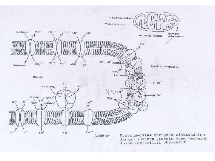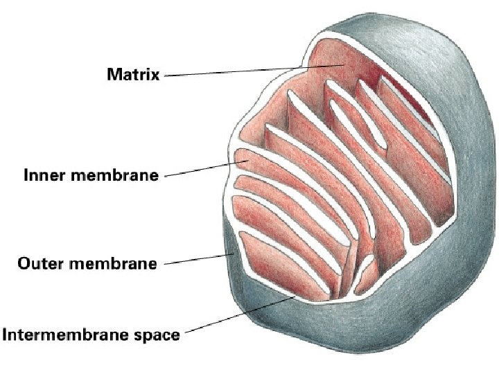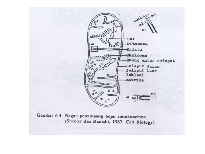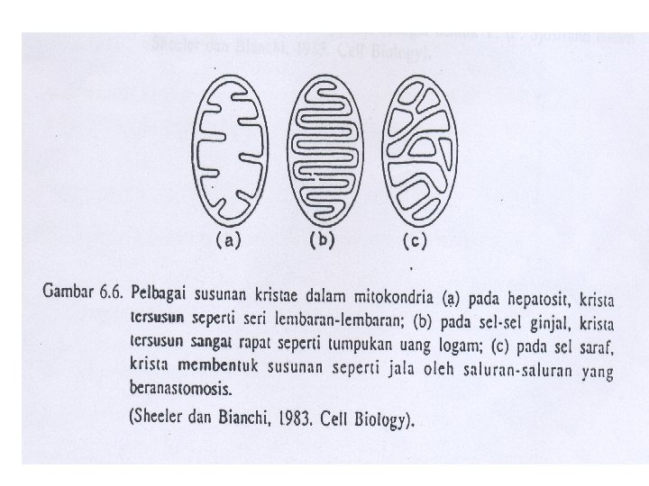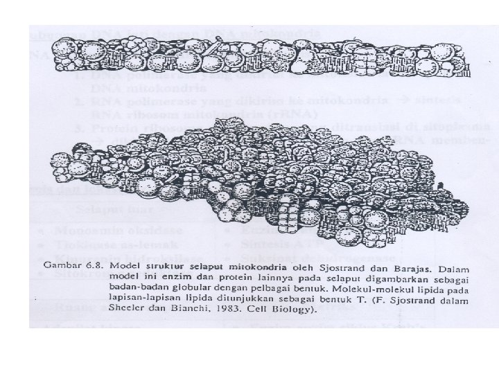 Struktur: • Selaput rangkap luar, dalam • Selaput dalam krista. Terdapat oksisoma yg berupa bola dng pedunkulus yg merupakan tempat utama proses fosforilasi oksidatif. • Matriks berisi cairan seperti gel & mengandung berbagai enzim siklus Kreb’s, garam, air dan DNA