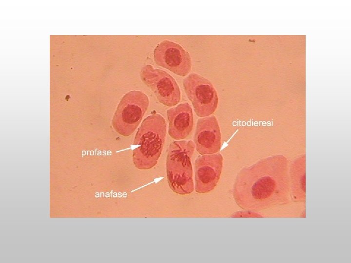 Immagini al microscopio ottico Possiamo riconoscere le 4 fasi? 1. PROFASE si iniziano a distinguere i cromosomi 3. ANAFASE i gruppi di cromosomi si allontanano 2. METAFASE cromosomi si allineano nella zona equatoriale della cellula 4. TELOFASE si stanno formando due nuclei figli Complessivamente…