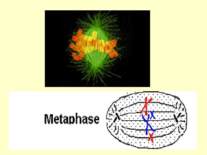 Metaphase • Chromosomes meet in the middle! 1. Chromosomes arrange at _______ of cell 2. Become attached to spindle fibres by _________
