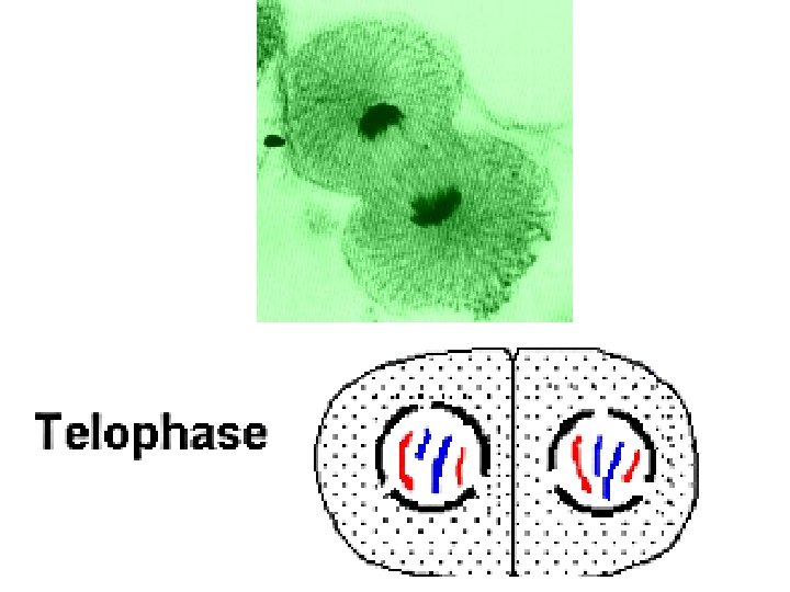 Telophase • Now there are ____ 1. Chromosomes uncoil 2. Spindle fibres disintegrate 3. Centrioles replicate 4. Nuclear membrane _______ 5. __________