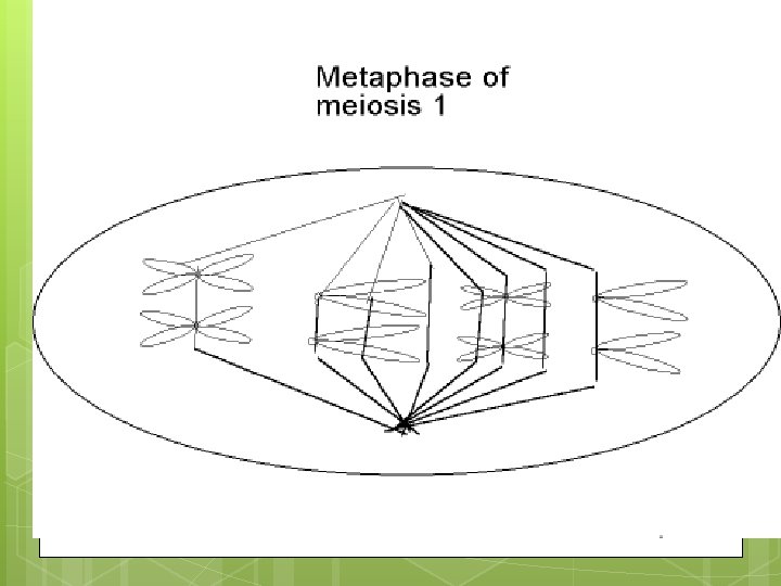 More M 1 Metaphase of meiosis 1 is very different from metaphase in mitosis (or M 2). In metaphase of M 1, pairs of homologous chromosomes line up together. In mitosis and M 2, chromosomes line up as single individuals. Anaphase of M 1: the spindle pulls the two homologues to opposite poles. However, the centromeres don’t divide, and the chromosomes remain dyads. Telophase of M 1: cytoplasm divided into 2 cells, each of which has 1 haploid set of dyad chromosomes