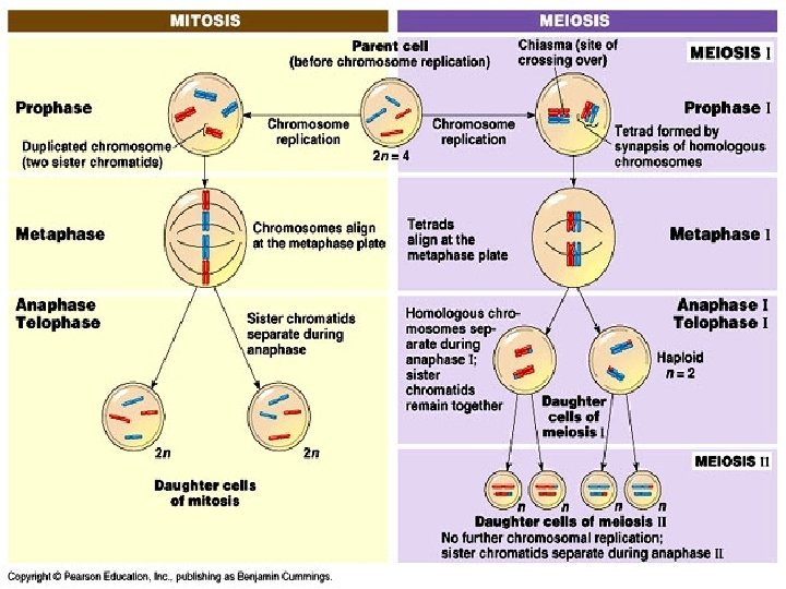 Meiosis (Prophase I) • Two pairs of homologous chromosomes = tetrad • Trading chromosome pieces in the pair is called crossing over. This increase variation as you can pass on one chromosome with a piece of the second.
