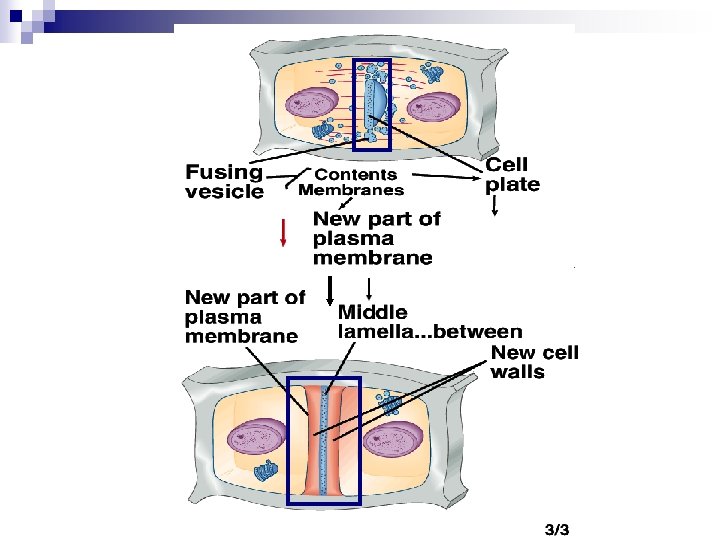 n n La división celular en plantas ocurre principalmente en lugares especializados llamados meristemos. Las regiones meristemáticas son lugares de crecimiento activo. En células vegetales durante la telofase, se forma una placa celular en el centro de la célula dividiendo el citoplasma en dos partes iguales.