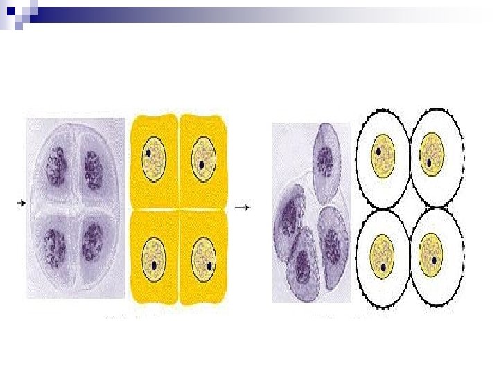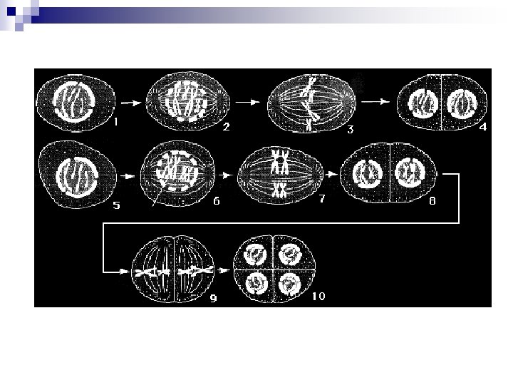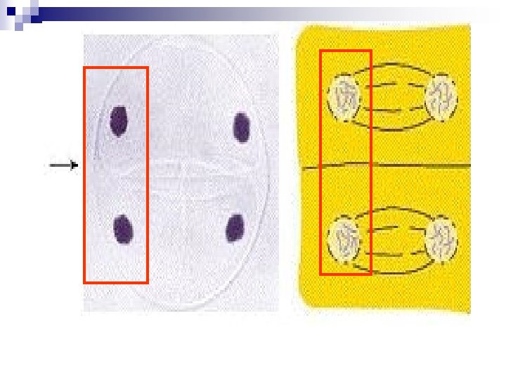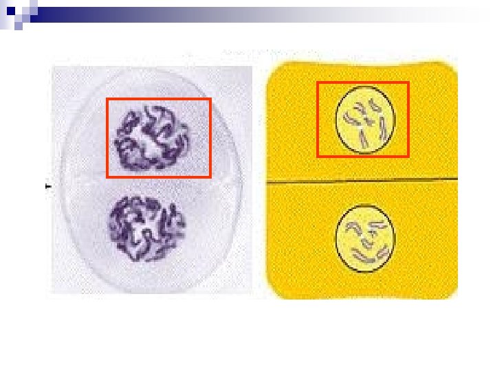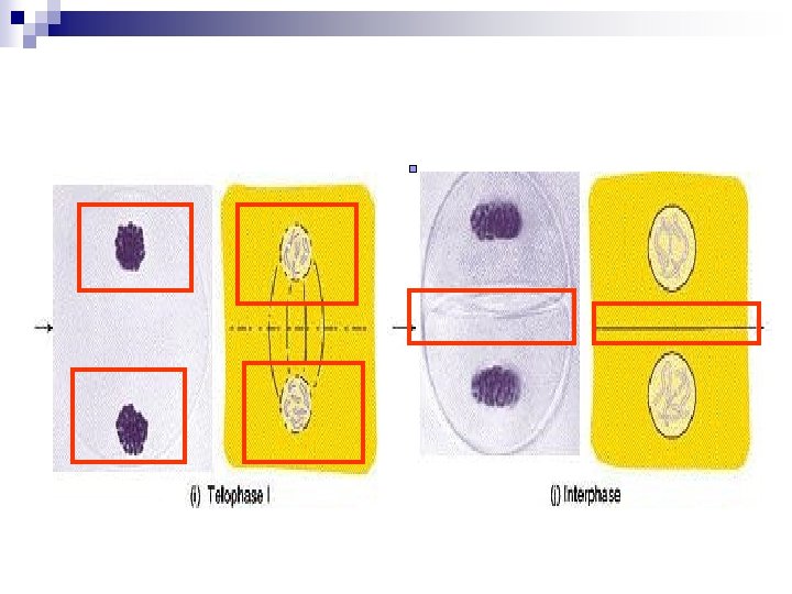 Telofase II n n Los cromosomas estan en los polos. Cromosomas se desenrrollan. Se forma la membrana nuclear y el nucleolo. Ocurre división celular; citokinesis.
