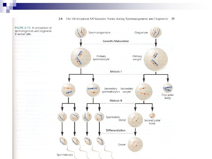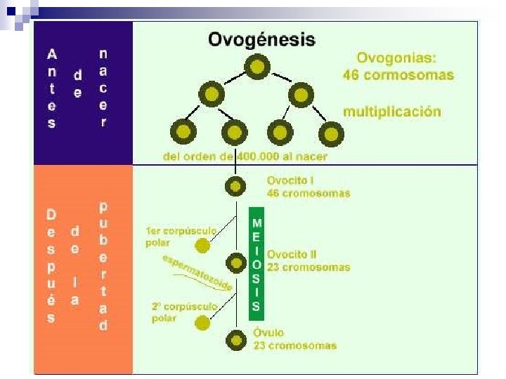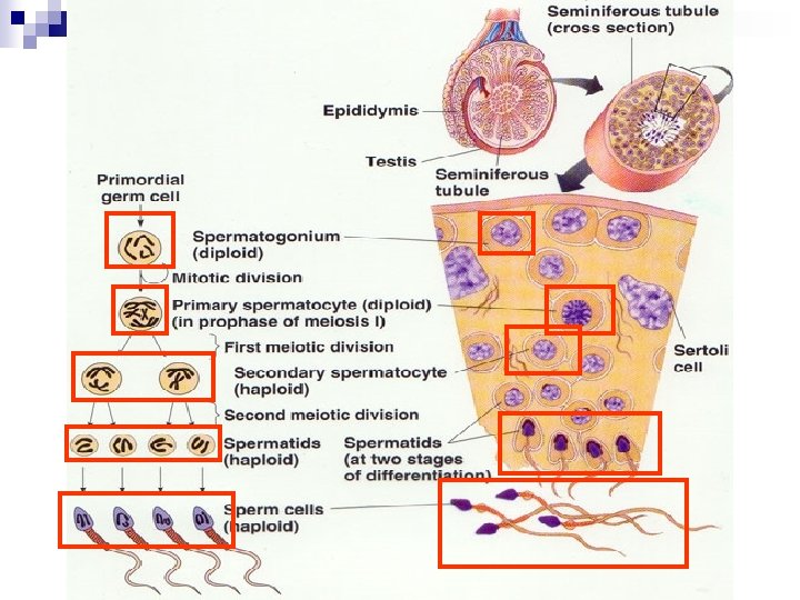 Espermatogénesis n En los humanos comienza en la pubertad. n Ocurre en los testículos. n Los espermatogonios (células germinales premeióticas inmaduras) proliferan a través de mitosis, se diferencian y forman los espermatocitos primarios.