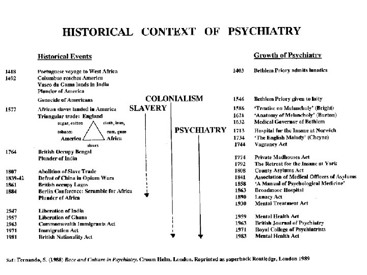 RACIST DISCOURSE IN MODERN TIMES Africans did not get depressed because they lacked ‘sense of responsibility’ and their thinking resembled that of ‘leucotomised Europeans’ (Carothers, 1951) Asians, Africans and African-Americans show less developed ‘emotional differentiation’ (Leff, 1973, 1977) Racist IQ movement (Jensen, 1969) supported by Eysenck (1971, 1973) Repeated by Herrnstein & Murray (1994) and Rushton (1997) Also note Depression became commoner in Africans after Ghana became independent (Prince, 1968) ‘Schizophrenics’ have better outcome in under-developed countries (WHO, 1979) High rates of schizophrenia among Blacks in US, UK, Netherlands (see Fernando, 2003) References See Mental Health, Race and Culture (Basingstoke: Palgrave 2002) and Cultural Diversity, Mental Health and Psychiatry (Hove: Brunner-Routledge 2003) by Suman Fernando