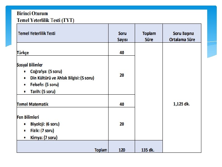 İKİNCİ OTURUM SINAV SÜRESİ TESTLER Soru Sayısı İki test 80 Üç Test 120 soru Türk Dili ve Edebiyatı-Sosyal Bilimler-1 40 Sosyal Bilimler-2 40 Matematik 40 Fen Bilimleri 40 Toplam Cevaplanacak soru sayısına göre soru başına ortalama süreler 160 Dört test 160 soru 2, 25 dk 1, 125 dk 180 dk Geçmiş yıllarda yapılan sınavlarda soru başına 0, 81 - 1, 68 dakika arasında değişen süreler verilmekte iken, YKS’de soru başına 1, 125 - 2, 25 dakika verilmiştir. YKS’de, bilinçli bir adayın bir veya iki puan türünden bir programa müracaat edeceği varsayılmaktadır. Bununla birlikte Yükseköğretim Kurumlan Sınavında puan türlerinin tümünden tercih yapmak isteyen adaylar için de yeterli süre verilmiştir. .