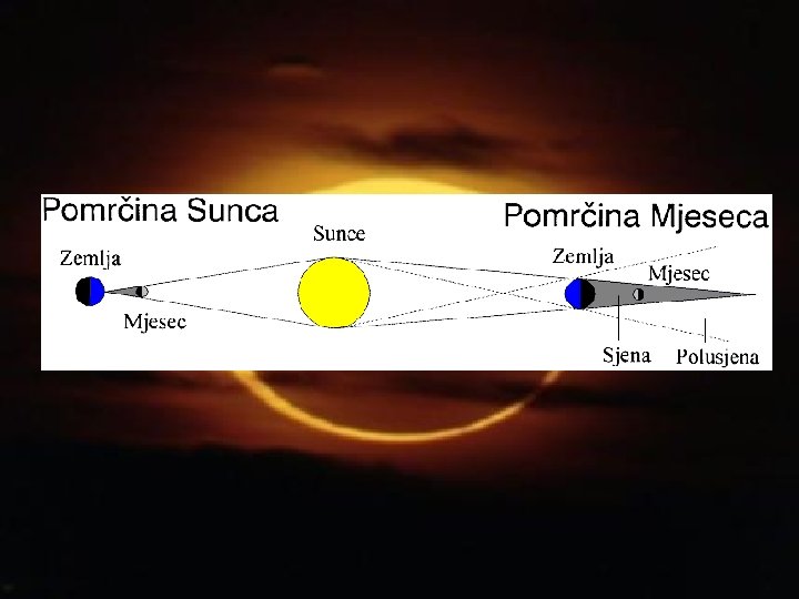 • Uzajamni položaji Sunca, Mjeseca i Zemlje dovode do pomrčine Sunca i Mjeseca. Totalna ili potpuna pomrčina nastaje samo za promatrača koji se nalazi unutar Mjesečeve sjene. Promatrač u polusjeni vidjet će Sunce samo djelomice prekriveno Mjesecom - to je djelomična pomrčina. • Pomrčina Mjeseca nastaje kada Mjesec uđe u Zemljinu sjenu. One se vide samo noću. Pomrčine Mjeseca mogu biti potpune i djelomične, a pritom svim promatračima izgledaju jednako.