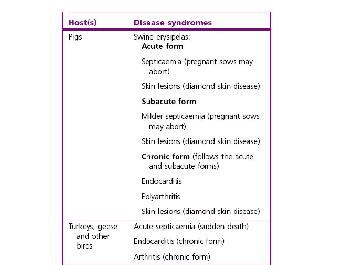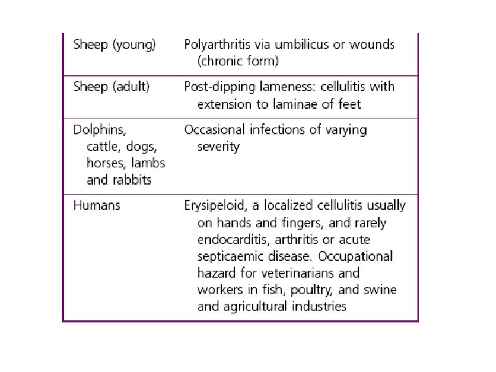 ERYSIPELOTHRIX’LER • MOLLICUTES Sınıfı • V. Dizi-henüz tam belirlenememiş – Erysipelothrichaceae • Erysipelothrix – E. rhusiopathiae (insidiosa) Domuz Kızılı Koyunlarda poliartrit, pnömoni, endokarditis Hindilerde septisemi, poliartrit, endokarditis İnsanda deride lokalize selülitis