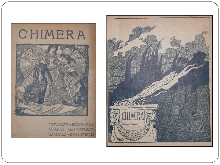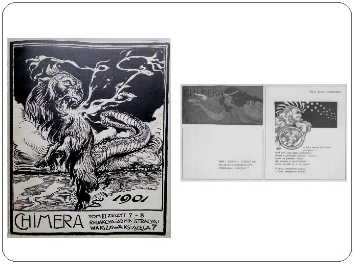 Mladopolské časopisy �časopis Chimera (1901– 1907): opět Miriam; nepravidelně vycházející umělecký almanach (30 sešitů) - tištěný na speciální papír, originální písmo („dovezené“ z Ameriky), pečlivá a originální grafická podoba - elitní charakter (drahý, nízkonákladový časopis; pečlivý výběr náročných textů) Autoři: Leśmian, Berent, Kasprowicz, Staff, Żeromski, Wyspiański aj.