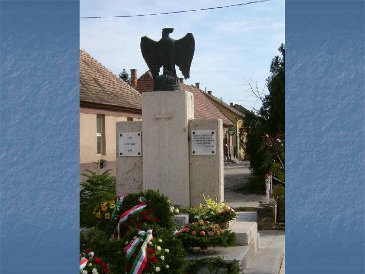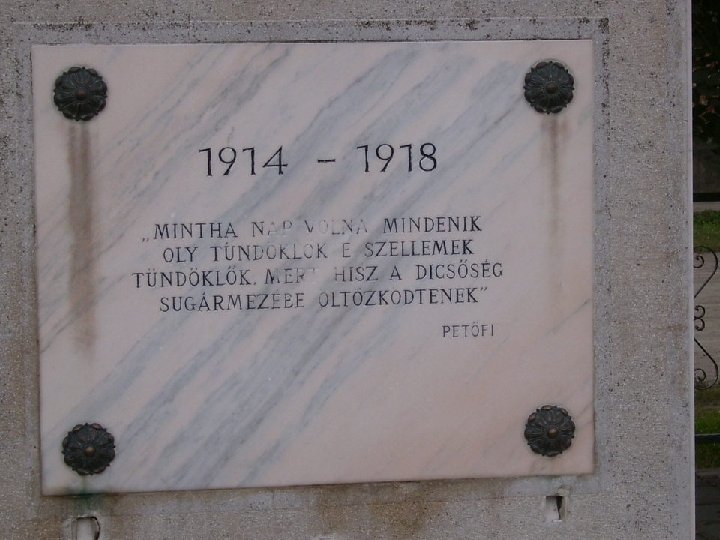 Patrona Hungaria 1914 -1918 Alkotója Markup Béla szobrászművész Az I. világháborút lezáró Párizskörnyéki (Versailles - Trianon) békék nem oldották meg Európa egyetlen problémáját sem, ellenben újakat teremtettek, s olyan éket vertek a nemzetek közé, hogy lehetetlenné vált a békés együttműködés. Az I. világháborúban 120 ócsai személy szenvedett hősi halált a különböző frontokon. Emléküket őrzi a Hősök terén 1928 ban felállított emlékmű. Markup Béla szobrászművész Stróbl Alajos tanítványa. Nevét az Országház főbejáratát díszítő két nagy oroszlánszoborral tette ismerté. Az emlékművet az Ócsai Polgári Kör anyagi támogatásával Kiss Károly ócsai kőfaragó mester restaurálta.