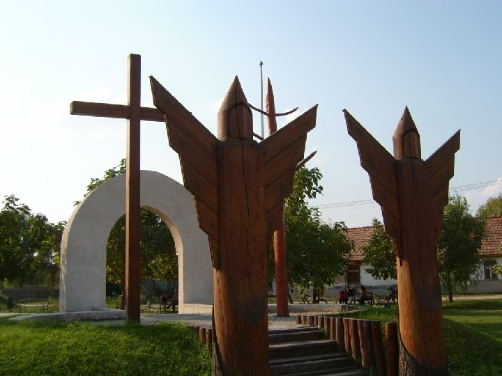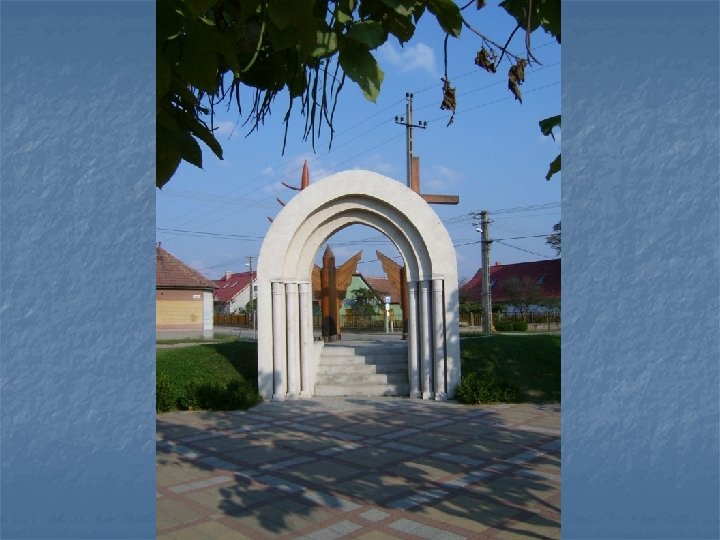 Ócsai millenniumi emlékmű Tervezte Horváth Zoltán építész Az emlékmű a magyar államalapítás ezredik évfordulójára (millenniumára) létesült, és a történelmünket, kultúránkat jellemző kettősséget jelképezi. Nyugat és kelet ütközőpontján országunk a mai napig a keletnek kapuja nyugatra, és a nyugatnak kapu kelet felé. Hol a keletről, hol a nyugatról ránk törő erőkkel viaskodtunk, vagy fogadtuk be azokat. Népünk kultúrájában a keletről hozott és a nyugattól átvett elemek ötvöződnek sajátosan magyarrá.