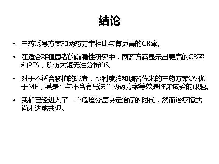 CR与诱导后和移植后OS延长相关 只接受化疗 化疗和移植 291例(年龄<70岁)MM患者只接受化疗,375例化疗后接受移植(右),比较两种情 况生存率与缓解程度的关系(CR vs PR or NR P<0. 01) 1. Lahuerta et al. J Clin Oncol. 2008; 26(3): 5775 -5782. 2. Alexanian et al. Bone Marrow Transplant. 2001; 27: 1037 -1043. 3. Wang, et al. Bone Marrow Transplant. 2010; 45(3): 498 -504. 4