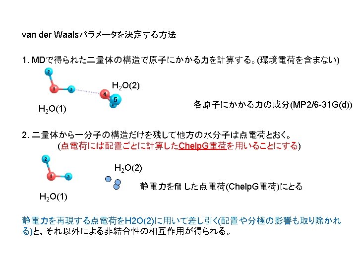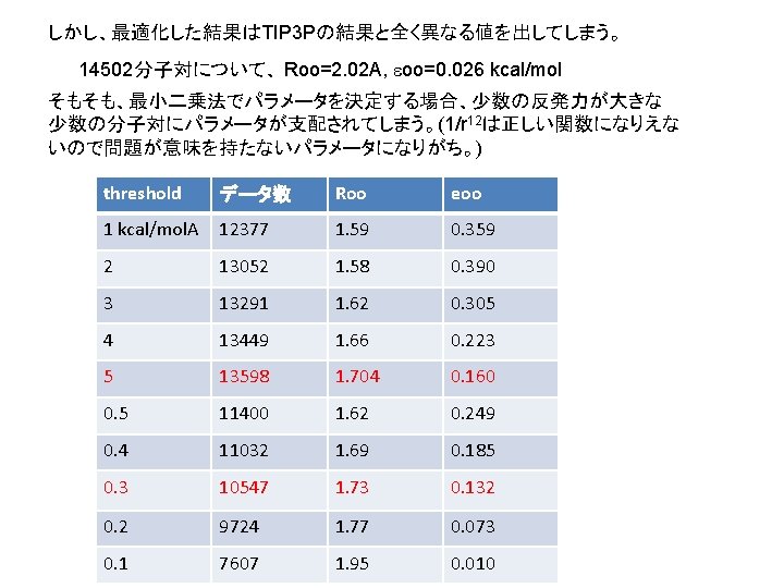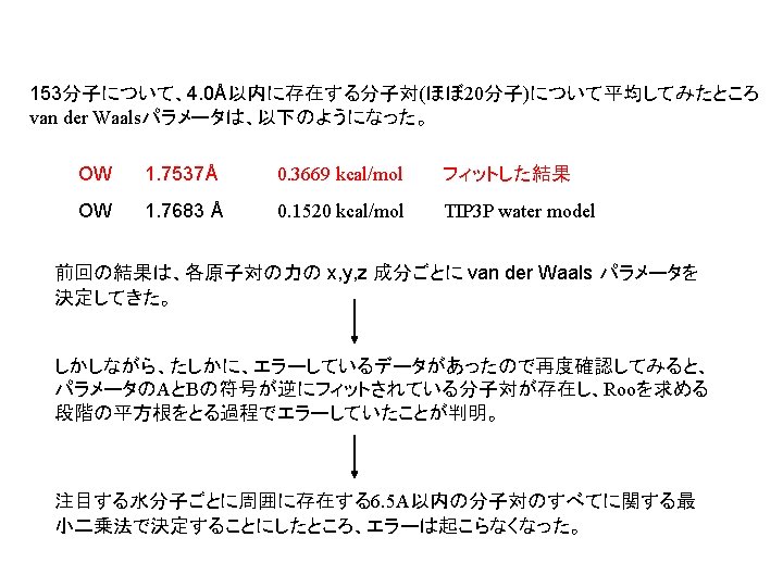 静電相互作用項 電荷 / e O fitting TIP 3 P PCM 原子分極率 H -0. 91048 0. 45524 -0. 834 0. 417 -0. 9041 0. 4520 O H 29. 72857 -10. 33892 双極子モーメント / Debye 2. 6298 2. 54 非静電相互作用項 (分極相互作用を無視した場合) 非静電相互作用 Roo / Å eoo / kcal. mol-1 fitting 1. 7097 0. 142 (前回 0. 367) TIP 3 P 1. 7683 0. 152