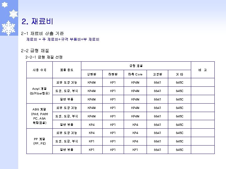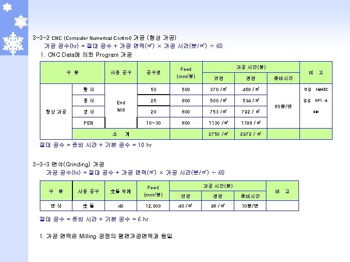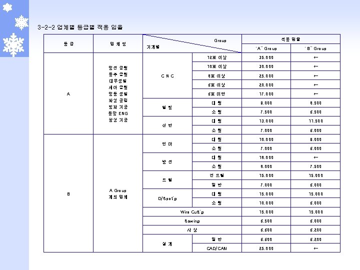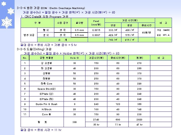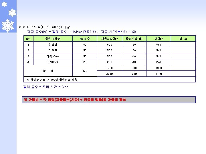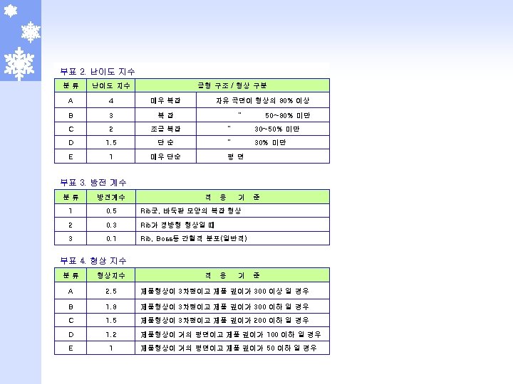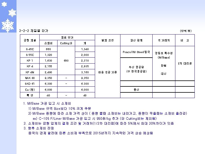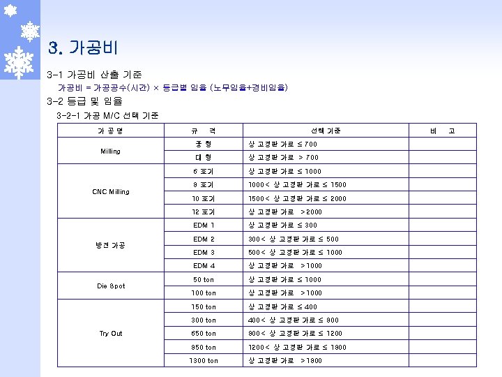 2 -5 -1 부식 단가표 (몰텍스 기준) 일반 부식 NO. 면 적 다중 부식 DN 17 DN 30 DN 05 MT 078, MXE 629(BK 5009) 무광부식 (DN 08, 15, 19, 20) 1 1 ~ 100 7, 500 3, 000 1, 280 100, 000 5, 000 2 101 ~ 500 7, 250 2, 750 900 1, 280 150, 000 4, 750 3 501 ~ 1000 7, 000 2, 500 800 1, 280 250, 000 4, 500 4 1001 ~ 2000 6, 750 2, 250 700 1, 280 300, 000 4, 250 5 2001 ~ 3000 6, 500 2, 000 600 1, 280 350, 000 4, 000 6 3001 ~ 4000 6, 250 1, 750 500 1, 280 400, 000 3, 750 7 4001 초과 6, 000 1, 500 400 1, 280 500, 000 3, 500 300, 000 100, 000 300, 000 기본 작업비 NO. 난이도 비 고 적용 제품 일반 다중 일반 1 2. 2 - R/Grille, Nozzle, Speaker Grille, Grille 2 2. 0 Side Cover, Navigation, HSG, G/Box, MUD Guade 3 1. 5 - QTR INR CVR, CVR T/Lamp, IN PNL 4 1. 0 상기외 전 품목 다중 STR’G Wheel, Horn CVR, Pack’g Brake ※ 부식비 = 기본 작업비 + (제품 면적 (㎠) × 단위 가격(원/㎠) × 난이도 = 가격 - 단 무광 부식은 Table 단가 바로 적용