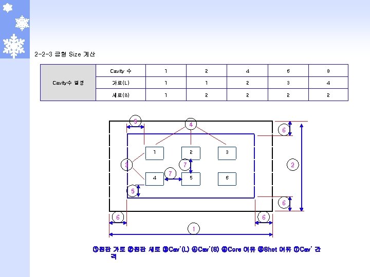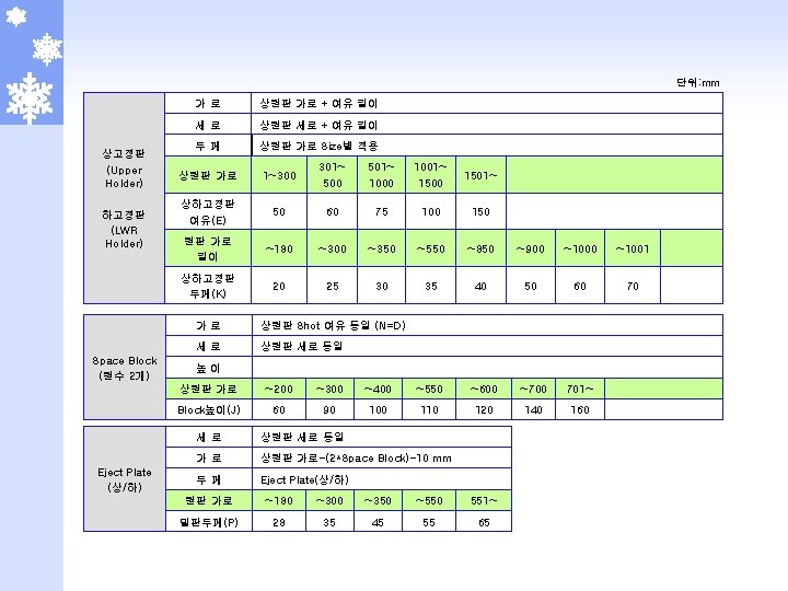 단위: mm Shot 여유 Cav’ 간격 상원판 (Cavity) 하원판 (Core) 제품 가로 ~30 ~100 ~200 ~300 ~400 ~500 ~600 ~700 ~800 801~ Shot(D) 40 50 60 70 80 90 110 130 150 170 제품 세로 ~110 ~140 ~260 ~370 ~450 ~550 ~660 ~1000 1001~ Cav’ 간격(A) 25 30 40 50 60 70 80 90 100 세로 (제품 세로(S)*Cav’수)+(Shot 여유*2)+(Cav’ 간격*(Cav’ 세로 -1)) 가로 (제품 가로(L)*Cav’수)+(Shot 여유*2)+(Cav’ 간격*(Cav’ 가로 -1)) 두께 제품 깊이 + 여유 두께(a, b) 상원판 높이(H) = 제품 높이 + 여유(a) 원판 가로 ~200 ~250 ~330 ~400 ~450 ~550 ~800 ~900 ~1000 1001~ a 40 50 60 70 80 90 100 120 140 160 하원판 두께(I) = 제품 두께 + 여유(b) 하측 Core 여유 원판 가로 ~200 ~300 ~400 ~500 ~600 ~700 ~800 ~900 ~1000 1001~ b 40 50 60 70 80 90 100 120 140 160 제품 Size ~300 ~600 ~800 ~1001 여유 (c) 20 30 40 50 60