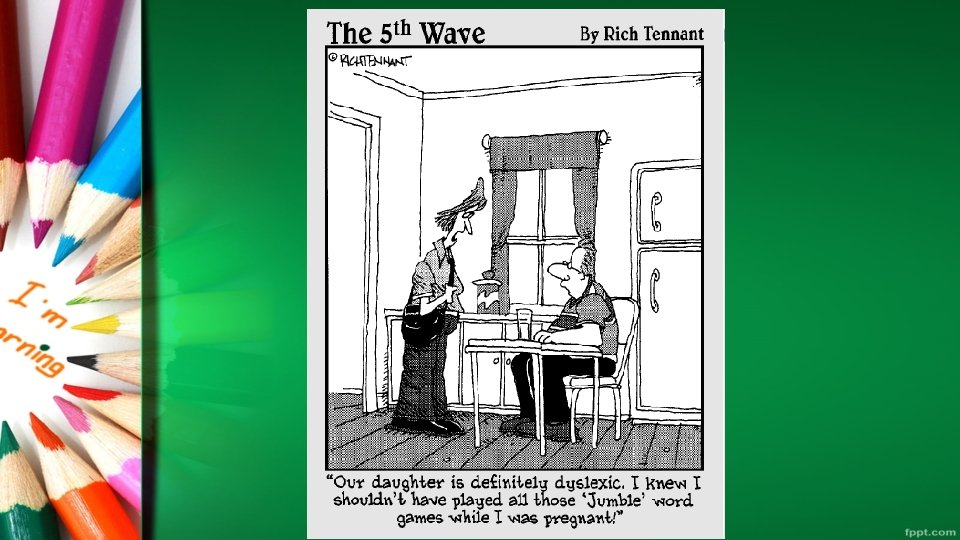 To všetko vieme • • • oneskorená reč, nemotornosť, ľavá-pravá, šnúrky podobné písmená, d-b-p, vynechávanie slabík, neporozumenie hlasné čítanie spájanie s inými poruchami krátka pracovná pamäť • AJ – iná písomná, iná zvuková podoba cool, eye • AJ – dĺžka hlásky – rozlišovacia funkcia – ship - sheep